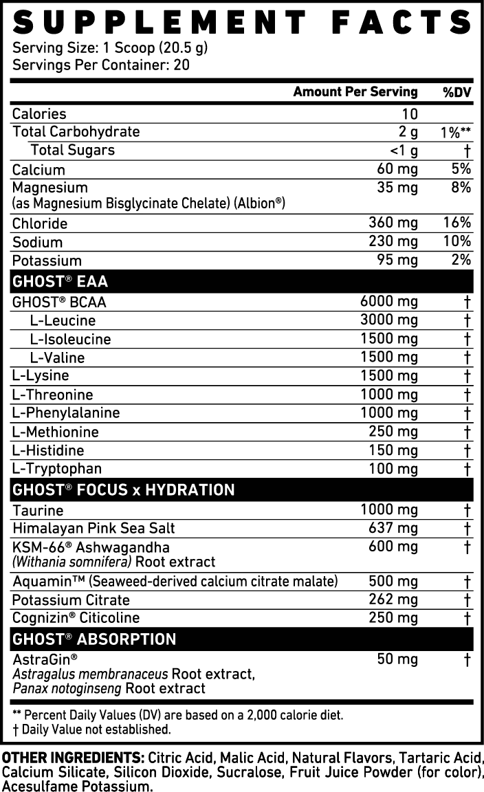 Our intra-workout POWERHOUSE. Packed with an EPIC 10G total EAAs per serving, plus Astragin® for absorption... oh yeah, and we threw in fully efficacious doses of Taurine, Cognizin® and KSM66® for an added focus and hydration play. Enjoy GHOST® INTRA with us around the clock. We sip ours at the gym, at the office and even with the squad before a night out.